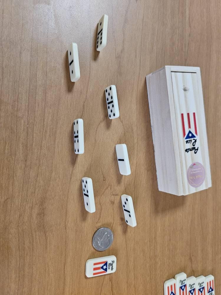 Miniature Dominoes Set in a Wooden Box with a Puerto Rican Flag to play with friends and family. It's a fun game for everyone. Its unique size and light weight mean you can take it anywhere to continue enjoying this game.